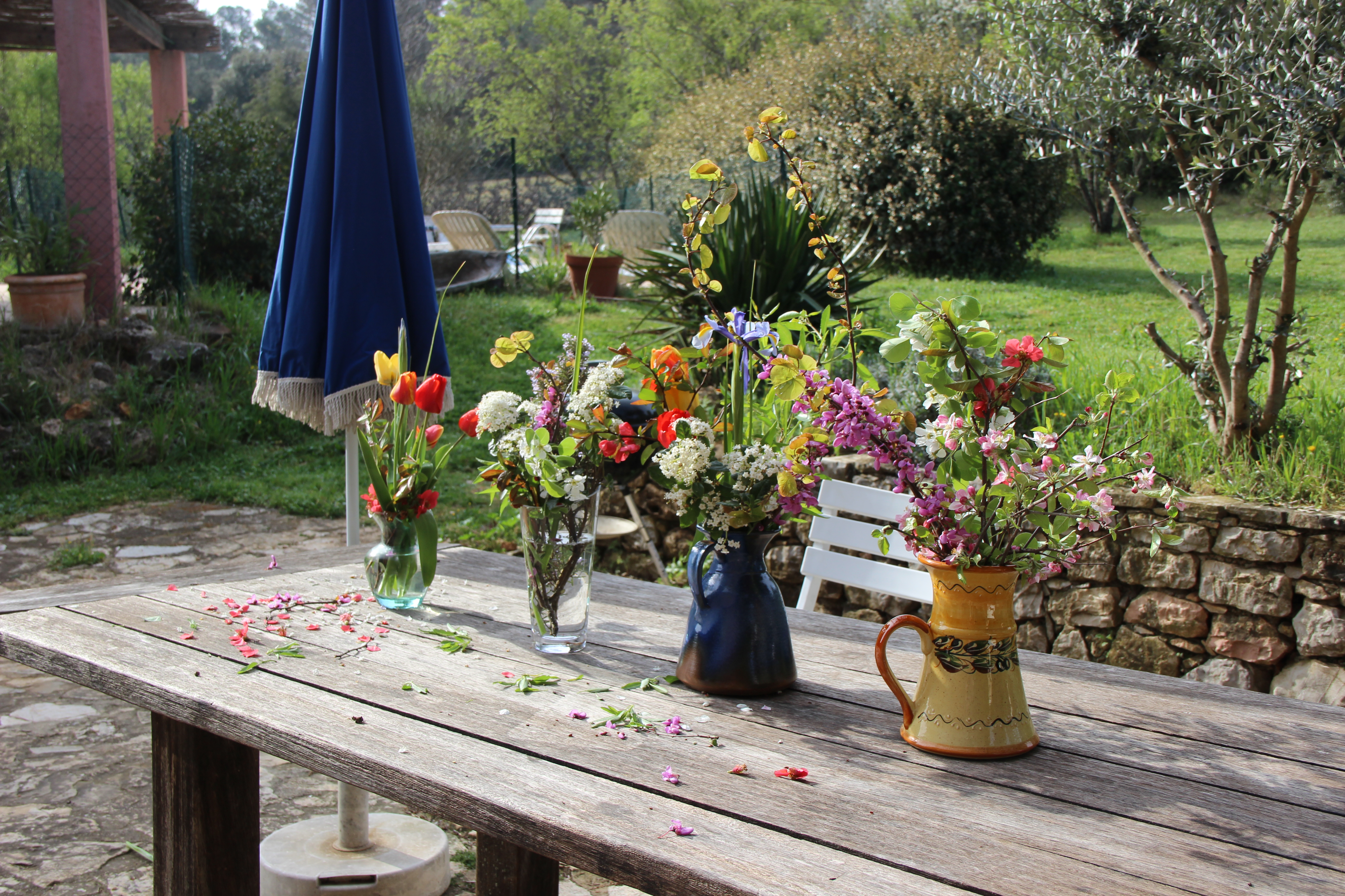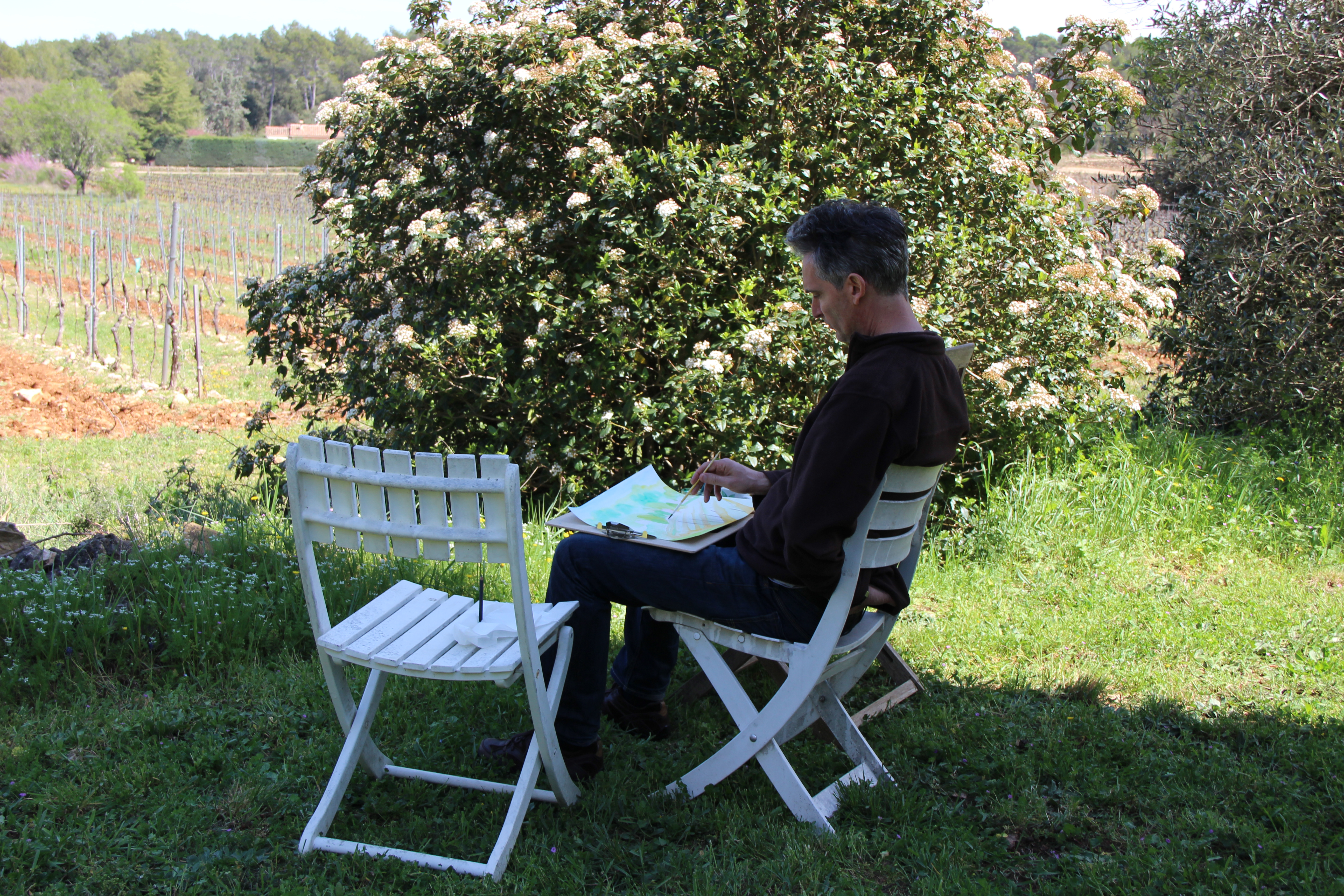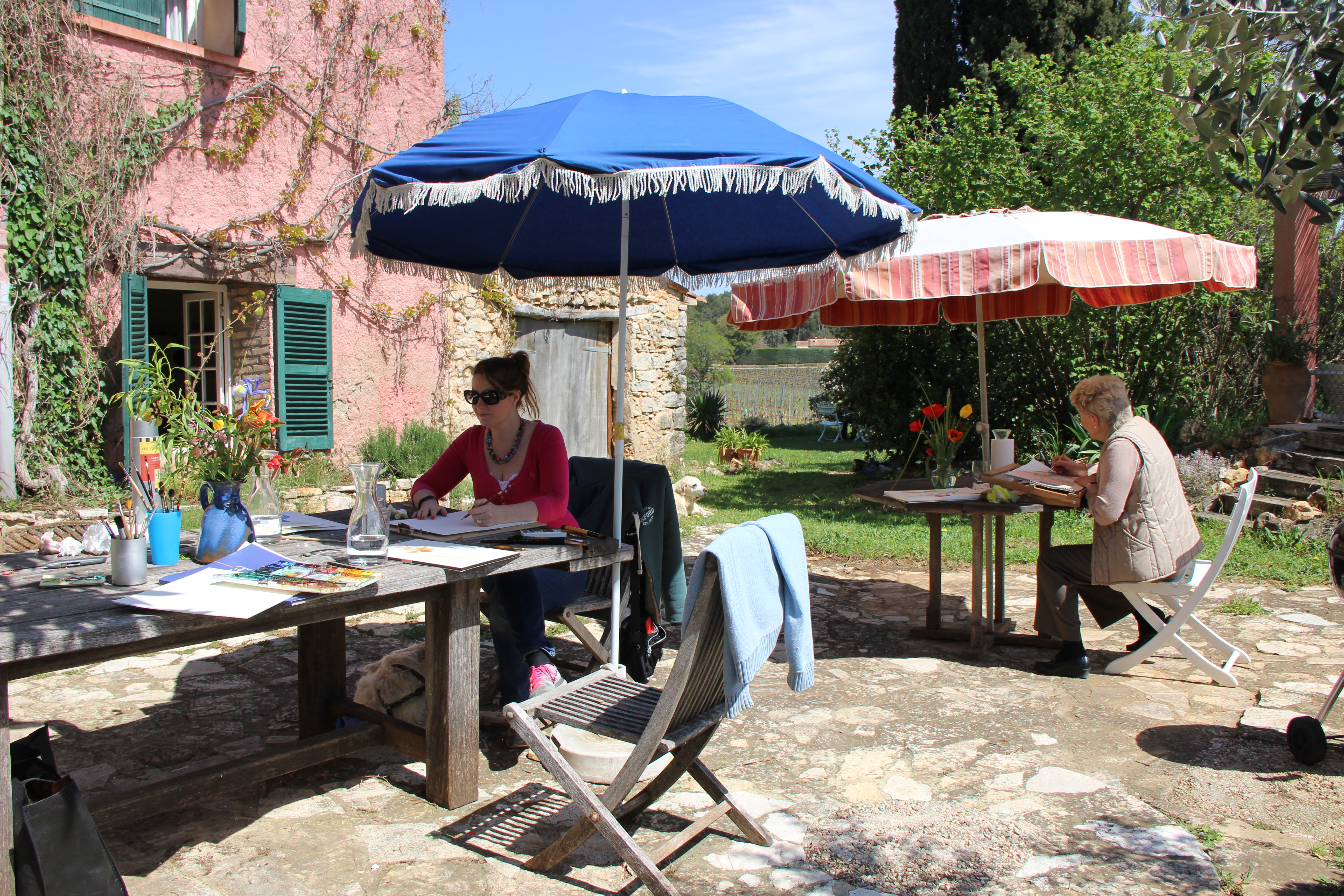 Anyone can paint, all you need is the freedom to let yourself enjoy the process and the magic of paper, water and paint will keep you happy for hoursJohn gave himself the very difficult task of painting the verticals and horizontals of the vineyards, not an easy task with several view points to confuse the painter. A beautiful painting was started, we hope you come back soon John.Eddie and Bluebelle painting masterpieces under the lilac tree which is now in bloom and smelling divine.Ruby painting a very beautiful still life. Blue Jug and wild flowers. Anne painting our pretty pink house