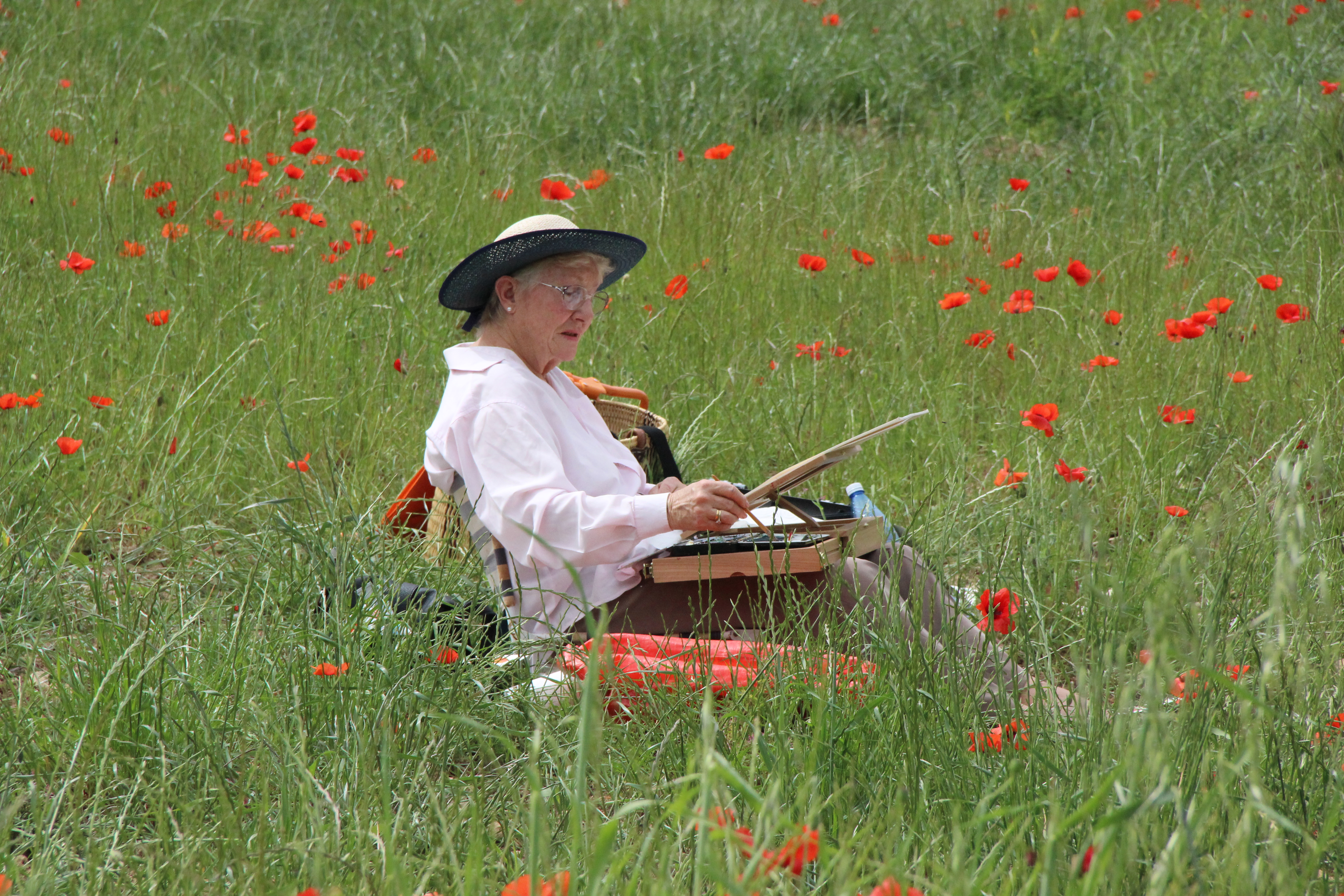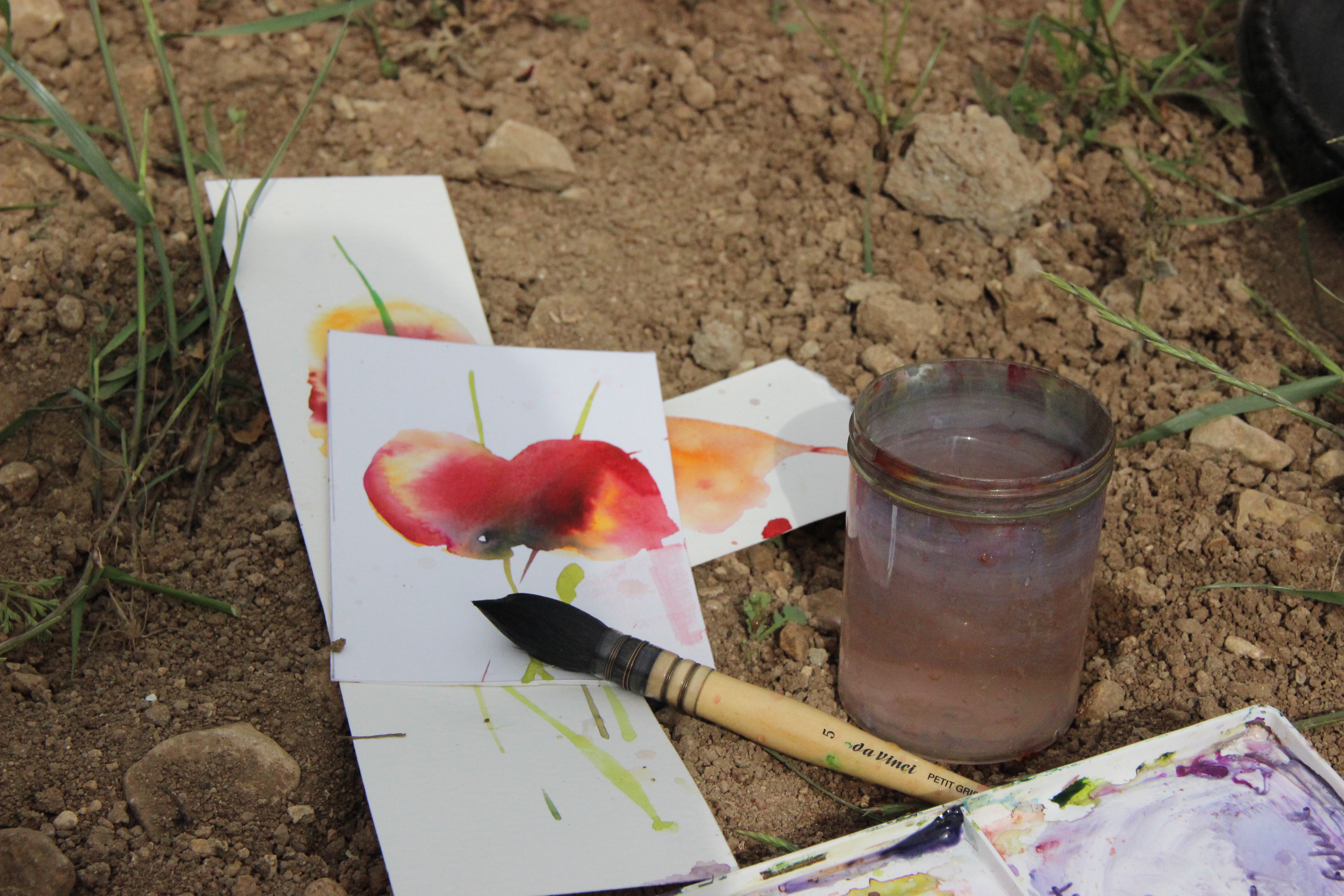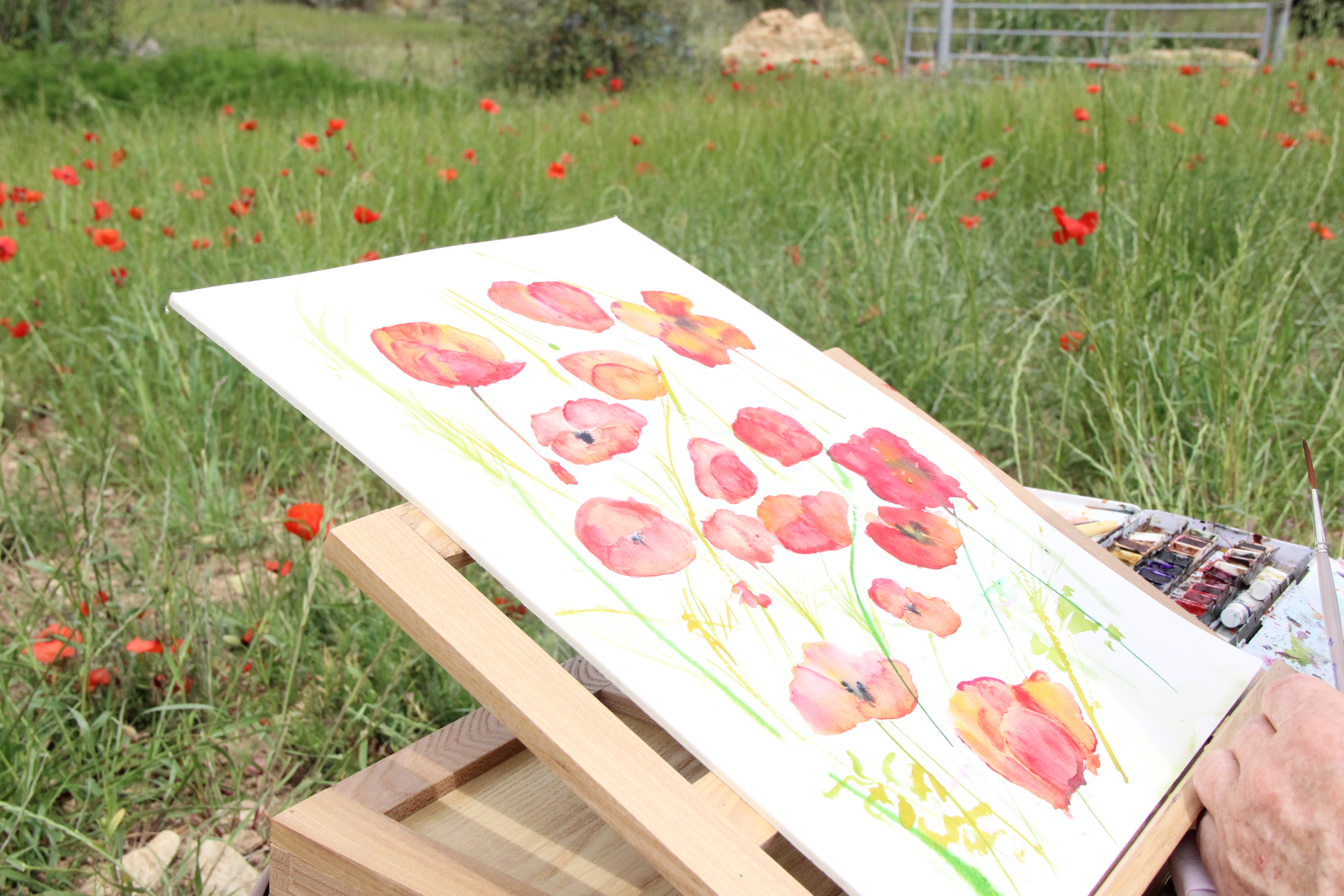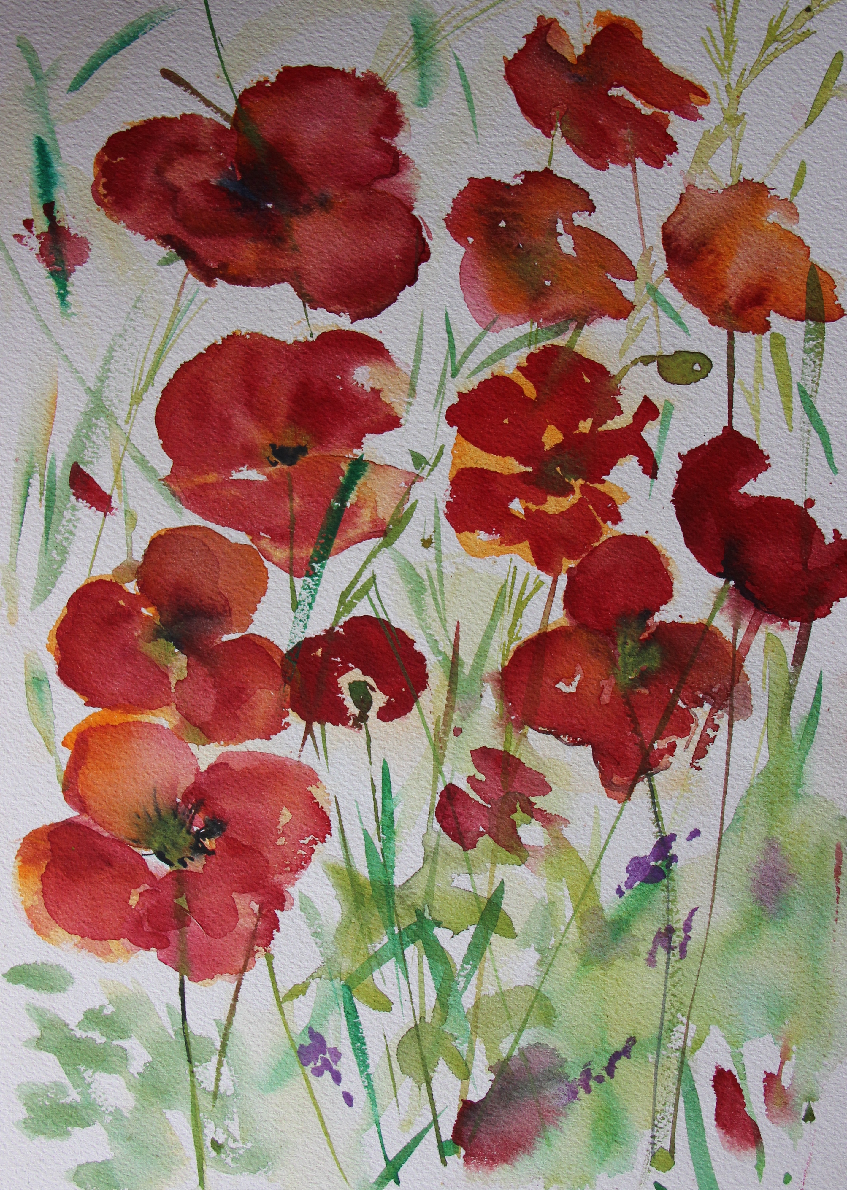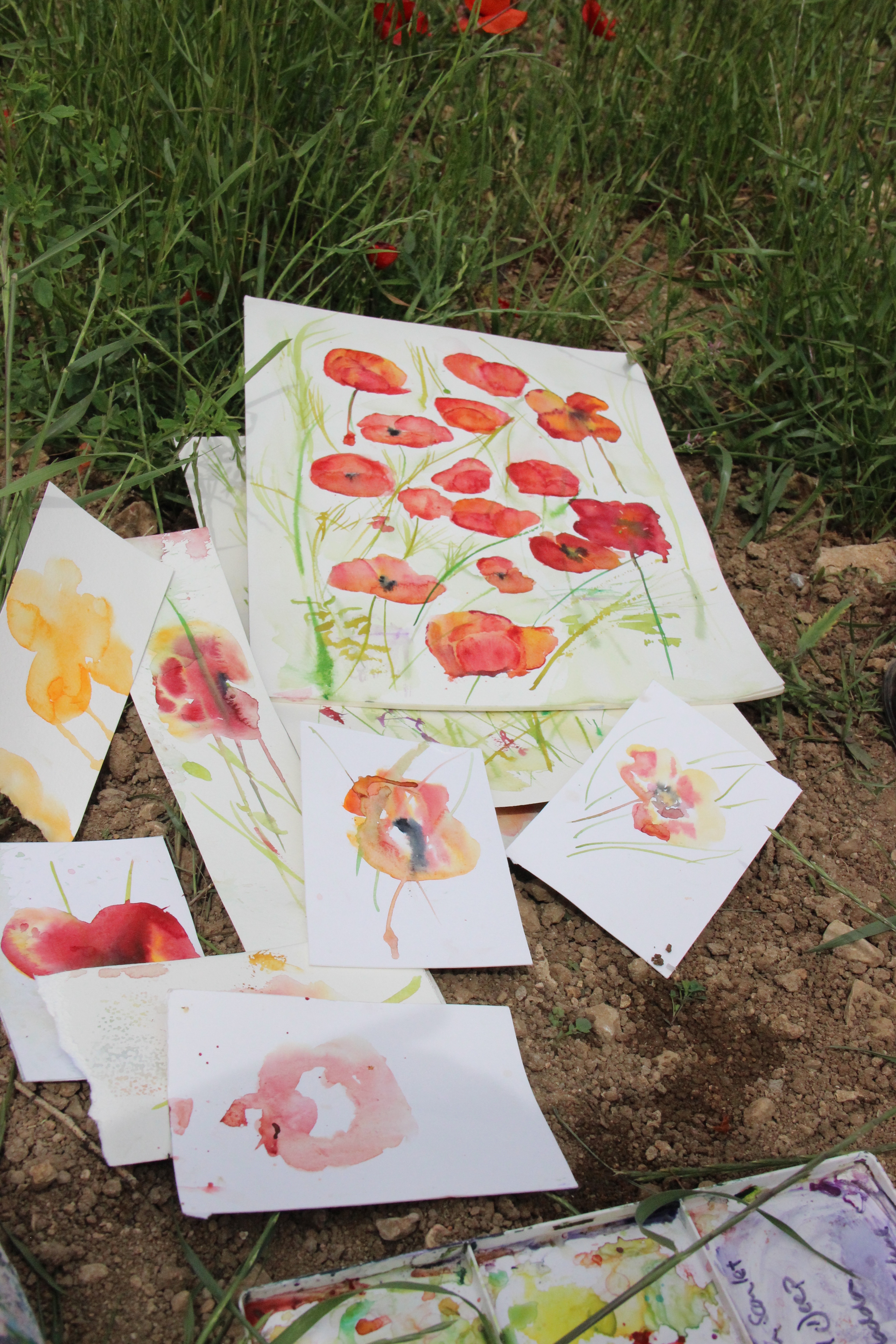 In a field near my atelier, we are working on painting very loose. First just painting the poppy with water on the paper, then adding cadmiun orange to the painted water waiting a while and using magenta and alizarin crimson and finally paynes great, lemon yellow and olive green for the stalks and there we are sitting amongst the insects and time flying by.