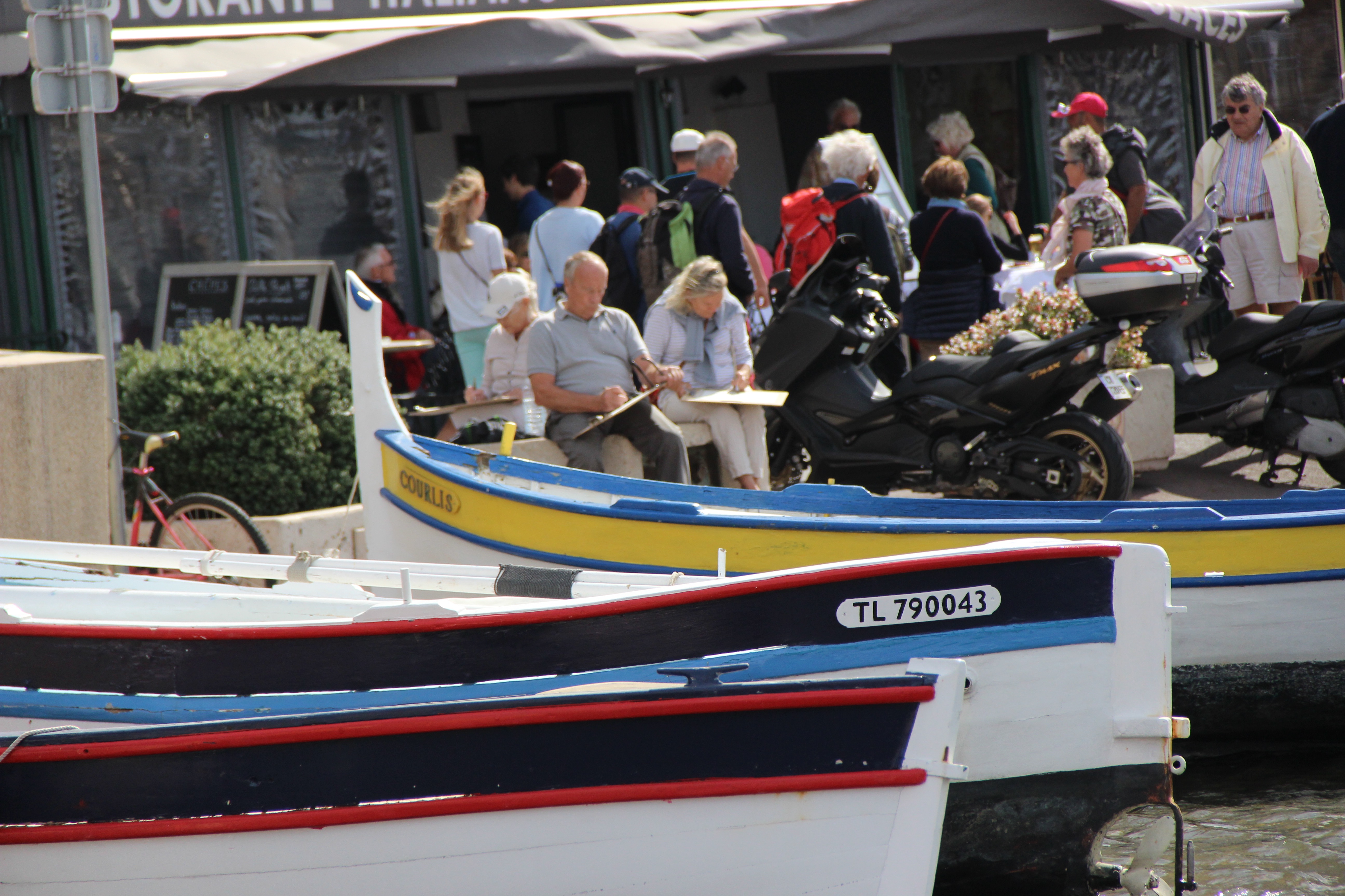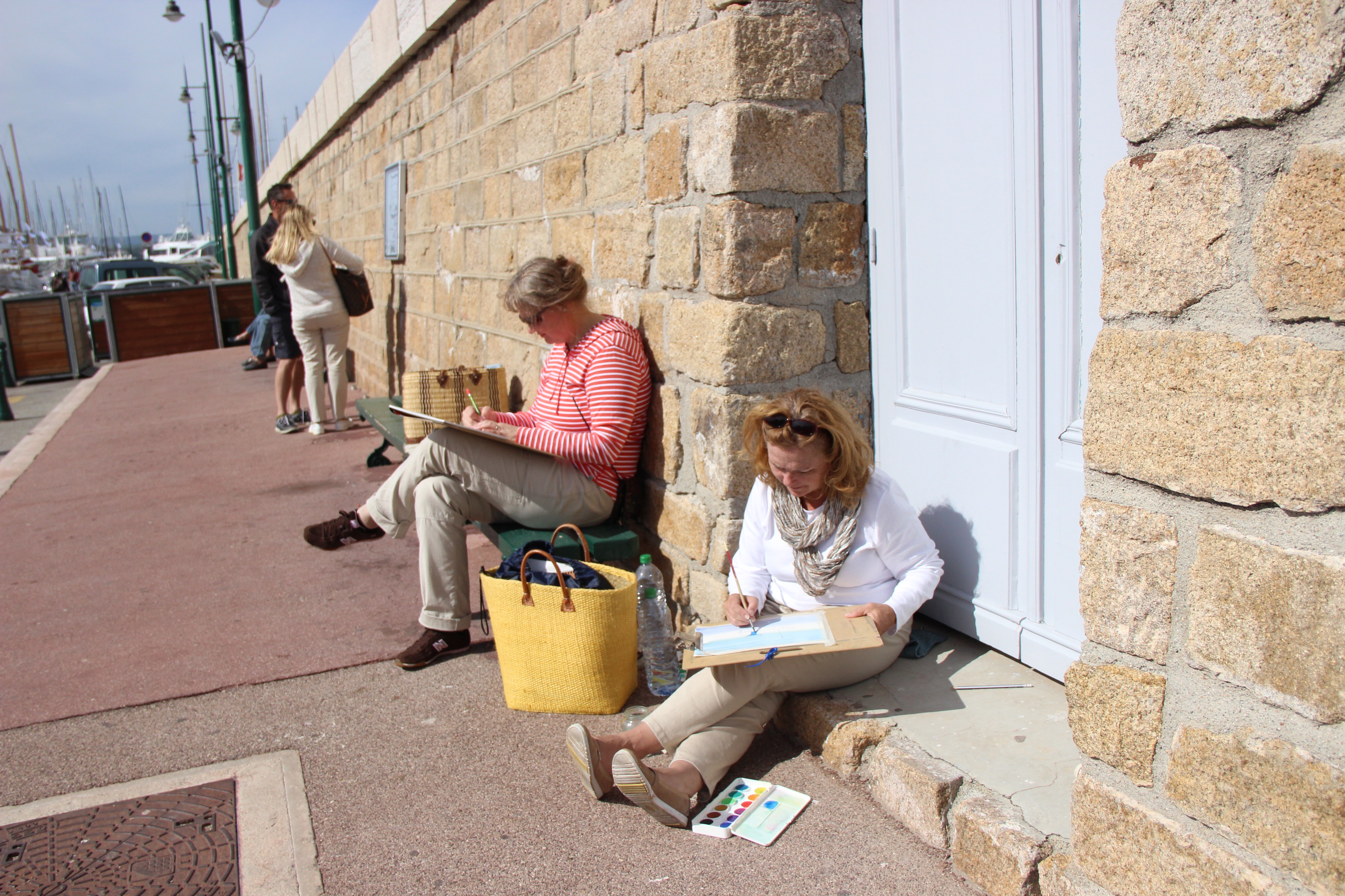 All the beautiful sailing boats had their sails very neatly tucked away, far too windy to sailing today. We were buffeted about as we walked the long walk from the far end of the car park to our painting spot, I had now idea how very busy it was going to be intact I have never seen it that busy for ‘Les Voiles’ and I just read on FB that it is the busiest it has ever been. Ruth on of our artists was here 50 years ago with her friend so it was quite a big step in time for her and of course St Tropez has changed quite a bit since then but she said she thoroughly enjoyed it.