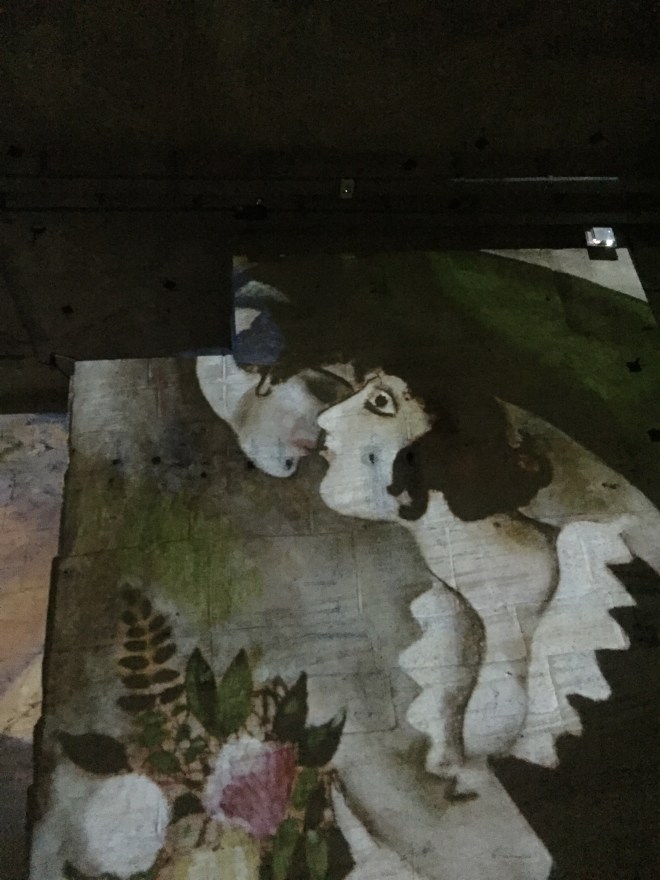I picked Susan and Michelle up in Nice on Thursday their plane was late because of a nasty storm. I got them home here late that night and woke them early the next day to go on another long trip, we went with many others on a coach trip to Les Baux en Provence to see Chagall’s art work illuminated, projected onto giant limestone pillars in the old quarries there. Truly an amazing experience, along with fabulous opera and then surprisingly an animated projection of Alice’s tumble into the land of giant rabbits and mad hatters tea parties, an odd combination me thinks. I could have just listened to the Opera and looked and the often strange and ugly Chagall paintings, or his beautiful mosaics and stained glass windows. The innocence of the lambs, the virgin Mary, mystical and mythical, huge and enlarged paintings, music reverberating around us. Magical!!