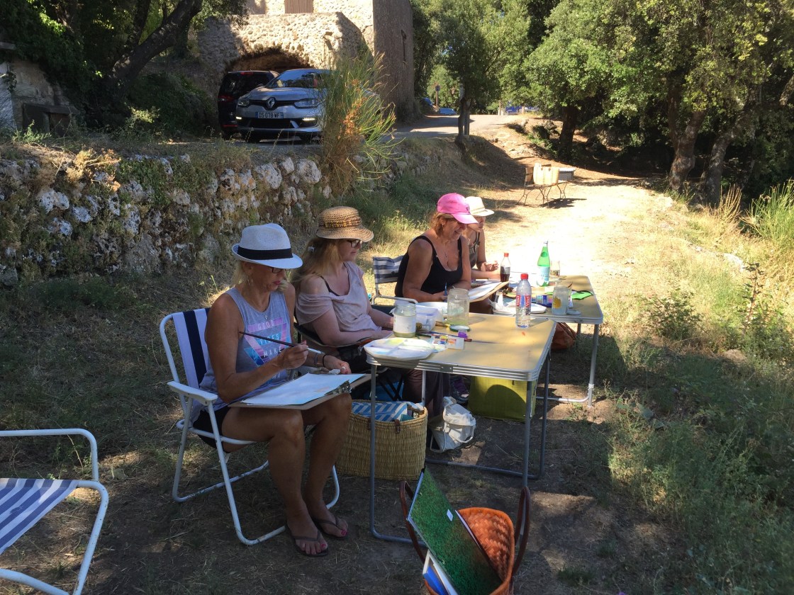 Every time there is a Paint Provence here there is laughter and love all around and this week has been no exception. First Mary and Tammy arrived on the TGV from Paris, Louise arrived in the afternoon in Nice and Yee arrived by TGV in Les Arcs. My lovely friend Janet cooked dinner for us. On Sunday we spent the morning in my studio and in the afternoon swimming in the pool and early evening painting seemed in order.