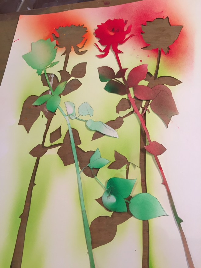 So first I bought the roses, then I drew the roses, then I cut them out and then I airbrushed them on to the paper below.