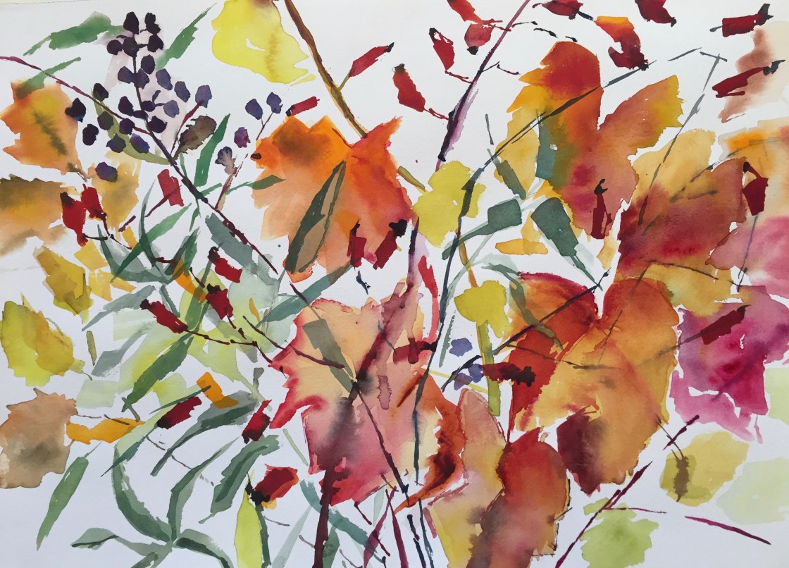 Hence a lot of leaves  were painted from my mostly reclined position on the sofa. Total rest the Dr. said and I obeyed. Although I managed to paint. I went pottering in the garden with Rosie and picked some vine leaves, juniper berries, sage and rosehips and wanted to work from figurative to abstract. The trouble was I couldn’t do too much without becoming exhausted. But here is the sequence of my paintngs followed by a few I painted a few years ago. In my next blog I will be talking about next years painting trips.