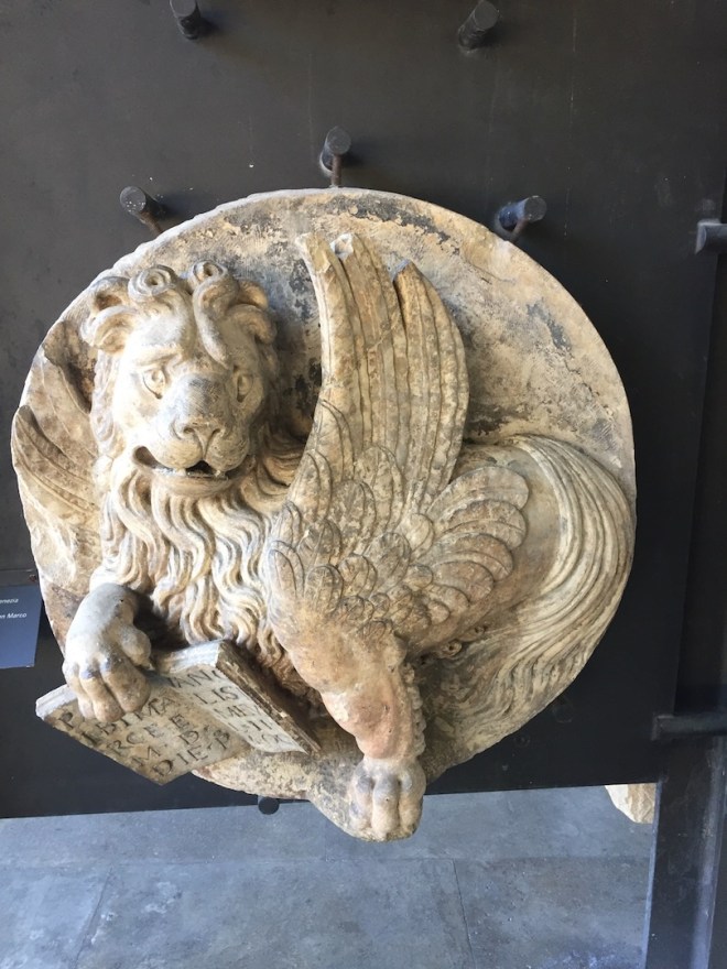 The Winged Lion of Saint Mark ( Saint Mark is the traditionally ascribed author of the Gospel of Mark. Mark is said to have founded the Church of Alexandria, one of the most important episcopal sees of Early Christianity. His feast day is celebrated on April 25, and his symbol is the winged lion.) Our literary lion holds the bible and is the symbol of the city of Venice and formely the Venetian Republic. I just love all the soft slightly amused lions we saw in Venice. I think the lion below would like to get off his stand and go for a stroll for once!
