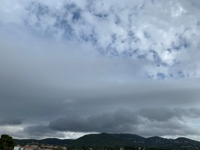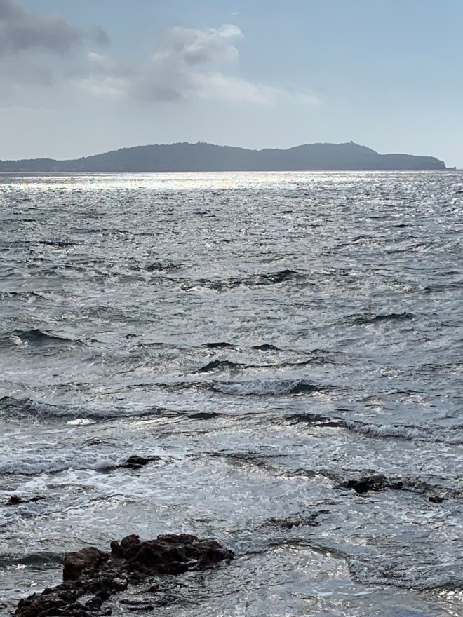 I started to think about all the colours I see all that joy I have when I truly open my eyes to see the abundance of colour and the changes of colour. Charlie, David and I went to the seaside in Hyeres. The wind blew, the sea threw itself onto the rocks and and then left them as quickly. We picnicked on chicken and spinnach salad. Spinnach leaves were blown into the coffee, into our glasses and onto our faces!! Quite the mess.