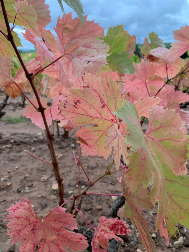Home and a walk with the dogs, still the sunlight trying to push through the heavy clouds seem to highlight the colours in the vineyards.
