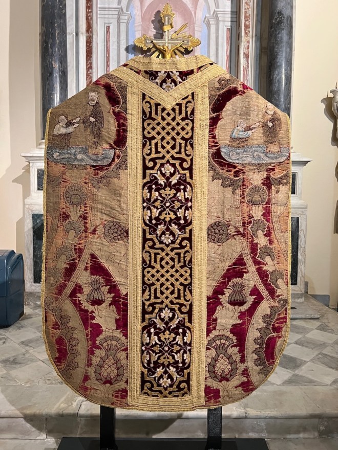 The Papal vestements were sold to the Duchy of Florence when Fivizzano became very poor, for a small amount of money and it just so happened that for the month of May 2023 the vestements were on loan from Florence, right there in the ancient museum of Fivizzano. I was very over excited and asked if Francesco could give us and my painters a guided tour. Yes of course he said. Guiseppe enthusiastically Italian, said leave it to me leave it to me. Soon a time was arranged and Guiseppe’s friend Francesca became our translator. They would not accept any money from us. They were so gracious, so kind and giving and so warm. We were being loved by strangers.