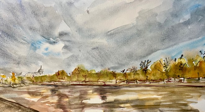 We had a private view of 14 Watercolours by Turner from his teenage years to his old age. We were taken through locked doors into a private viewing room and were shown with great knowledge by the women there his work. It was a gift and quite tear jerking really. From London I went to join the group of artists I paint with near Marlborough and had a tremendous time.